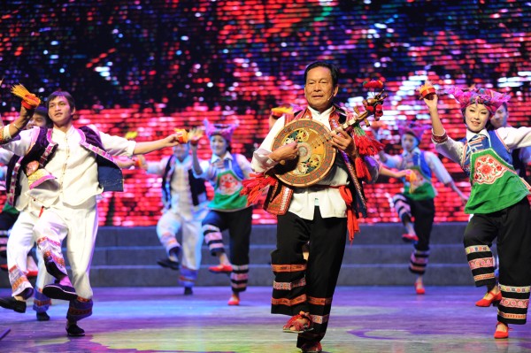“你唱歌,我弹琴,唱唱跳跳多开心;手挽手,肩并肩,各族儿女一家亲……”身着各少数民族服饰的玉溪市代表队一亮相就吸引了观众的眼球,他们带来的开场节目《各族儿女一家亲》唱出了激情,唱出了和谐。不同的服饰、不同的语言,诉说着共同的愿望——各族儿女大团结,用勤劳的双手共建美好的家园。云南民族村代表队的舞蹈《天地人鼓》以其磅礴激昂、震撼人心的气势,向观众描绘天地人鼓合一的绝美场景。布朗族弹唱《宰目》,曲调悠扬,音色独特,引人入胜,深受观众喜爱。作为国家级非物质文化保护遗产项目的《傣族象脚鼓舞》体现了傣家人“敲起象脚鼓,跳起孔雀舞”的民族风情,而作为傣族象脚鼓舞艺人波罕丙在舞蹈中的一招一式,不仅是在表演,更是在传承,同时也深刻地诠释了傣族象脚鼓舞的保护内涵。