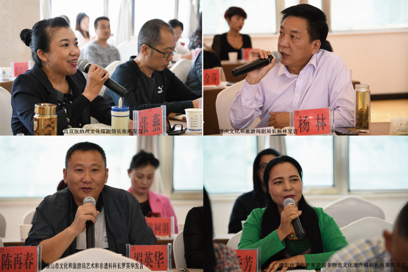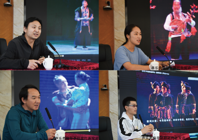 会议共同回顾了云南省第一至十届民族民间歌舞乐展演的金奖节目,观看了历届展演优秀节目录像。优秀节目《赶花街》《赶马调·赶马阿哥要出门》的编导陆庭文、李绍荣作为声乐类编导代表发言,优秀节目《阿哥四弦转花乐》《山乡乐汇》的编导孙丽、李家林作为器乐类编导代表发言,优秀节目《山花》《马鹿舞》《磨皮花鼓舞》的编导廖运宝、王峰、褚永英作为舞蹈类编导代表发言。节目编导们结合作品实际分享了挖掘整理编导节目的过程和艺术加工心得。声乐类专家殷海涛、器乐类专家吴学源、舞蹈类专家廖大昆进行了专业点评,并对各位编导的疑问进行了全面解答,为编导们指点迷津。