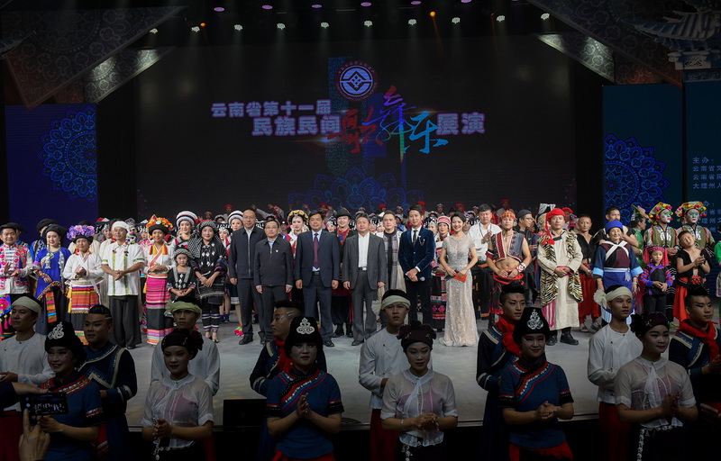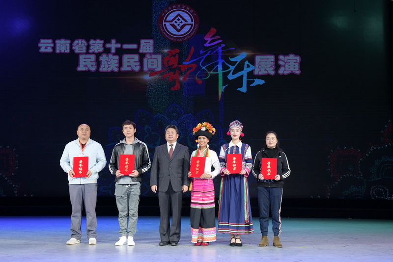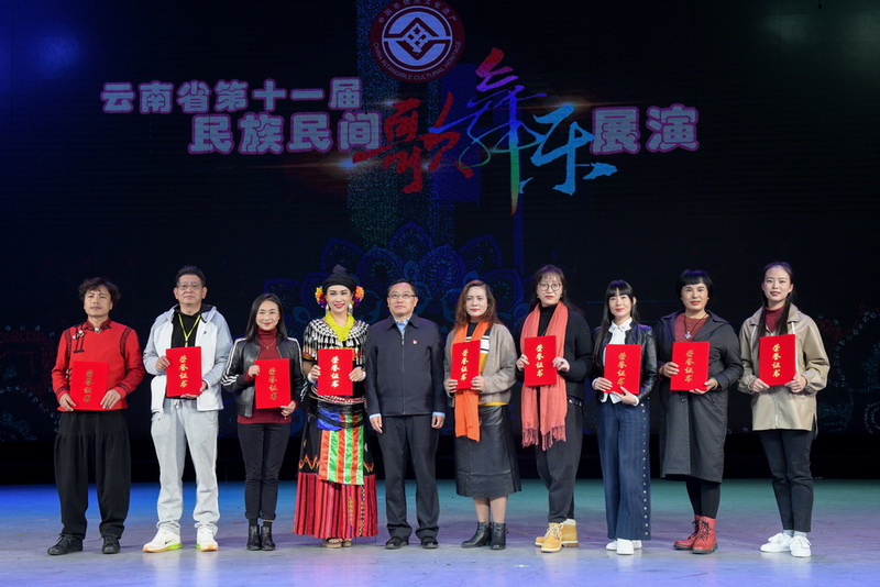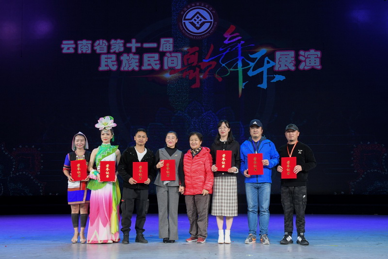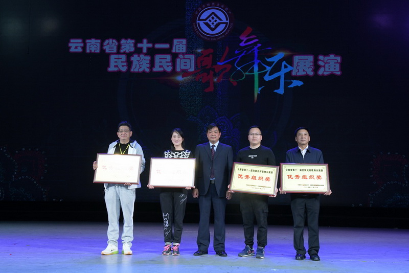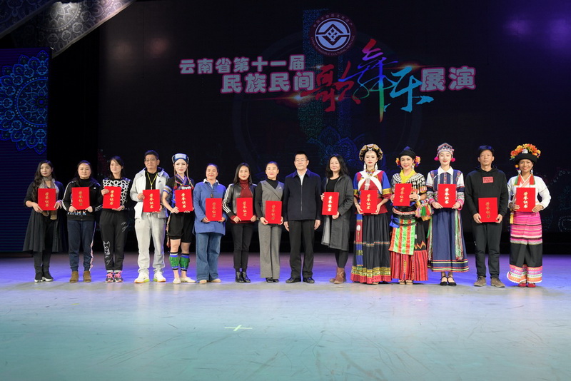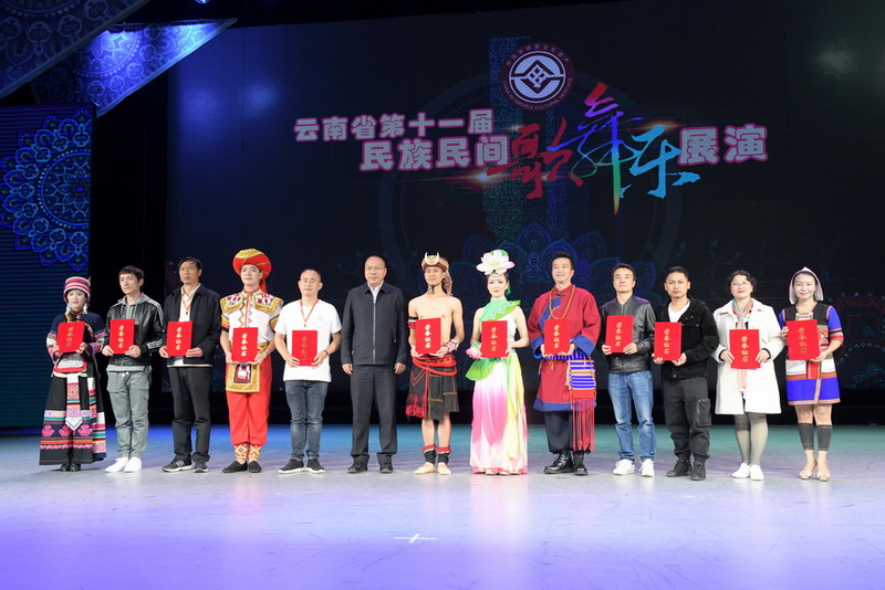 11月21日晚,云南省第十一届民族民间歌舞乐展演闭幕晚会在大理州群众艺术馆剧场精彩呈现。金银铜奖、传承奖和优秀组织奖在晚会隆重揭晓,9位评委从来自16个州市18个民族的69个节目中共评选出“云南省民族民间歌舞乐彩云奖”金奖10个、银奖12个、铜奖18个及优秀奖29个,另评选出传承奖5个、组织奖12个和优秀组织奖4个。历时5天的歌舞乐饕餮盛宴圆满落幕。