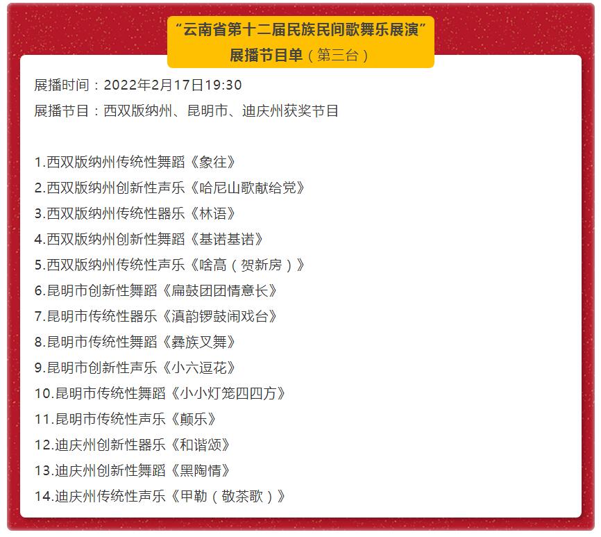 云南省第十二届民族民间歌舞乐展演节目展播(第三台)预告—西双版纳州、昆明市、迪庆州获奖节目
