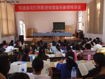 在举办培训班时,来自全县中小学的114名音乐教师参加培训,县花灯剧团、文化馆的专业技术人员从弥 渡花灯民歌的历史渊源、音乐特点到演唱技巧、花灯舞蹈基本动作等方面作了讲授和示范。全县101所中小学40759名学生每周开设一节花灯音乐课,每天上午课间操改做花灯健身操。