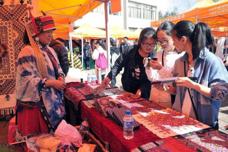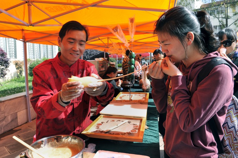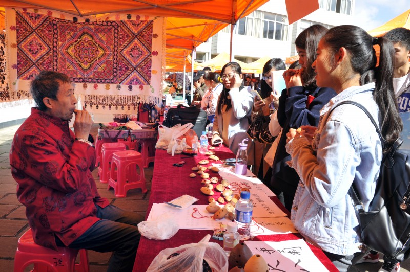 “这刺绣太美了!”“我喜欢那个扎染扇子的风格。”大学生们三五成群地游走于非遗展位前,有的跟传承人学起了葫芦丝、阿乌的吹奏,有的被面塑所表现的童年游戏所吸引,有的兴致勃勃地向传承人请教东巴画的含义,有的购买水酥饼、豆末糖一饱口福……一位从北方省份来到西南林业大学求学的女学生拿着糖画传承人所制作的“大龙虾”,说:“我觉得这次展览活动非常好,我原本以为只有北方才有吹糖人,原来云南的传承人也会做这个。”此次展览不仅让她领略到云南非物质文化遗产的丰富底蕴,也勾起了她的童年回忆。