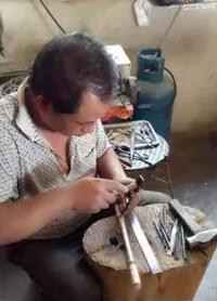 范木昌今年45岁,来自云南鹤庆县的板桥村,家里有兄弟四个。他的三个哥哥都是跟随父亲从事银器制作,从小他就习惯了这种敲敲打打的生活。由于儿时的耳濡目染,1990年初中毕业后他就拜父学艺,到1992年就能独立完成银器制作的整套工序。在2015年9月之前,范木昌一直都是个“老老实实”的银匠,直到去云南艺术学院参加完非遗传承人培训之后,他开始尝试发掘与传统银器制作不同的技法。