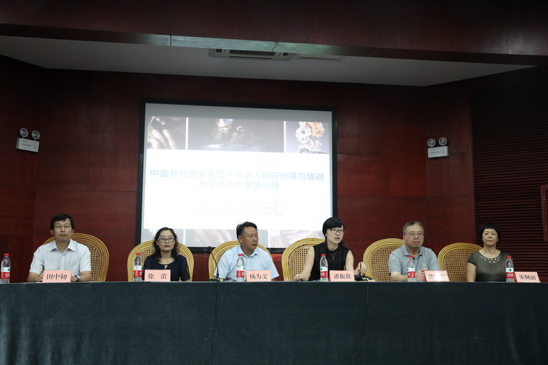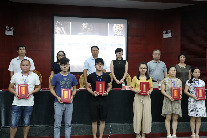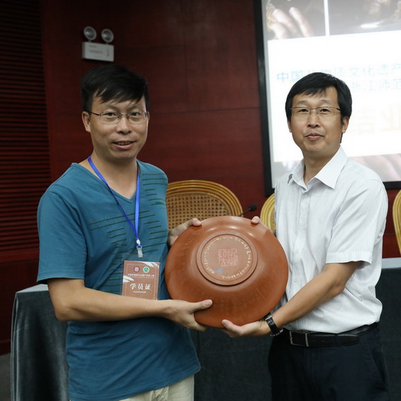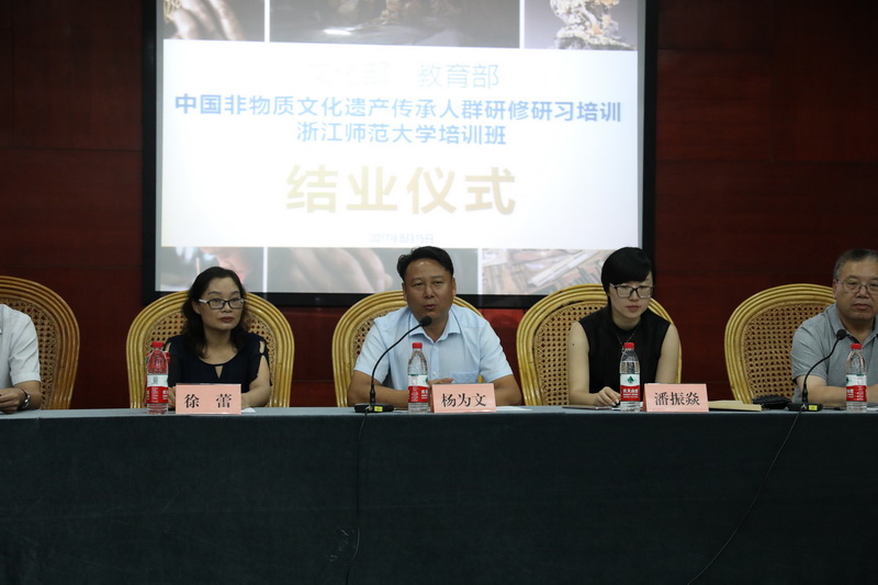 2017年8月15日,云南省第二期非遗传承人群研修研习浙江培训班结业仪式暨学员作品展览在浙江金华市博物馆隆重举行。浙江师范大学文化创意与传播学院院长田中初,云南省建水县委常委、宣传部长杨为文,建水县副县长徐蕾,云南省文化厅非遗处潘振焱,金华市博物馆副馆长朱佩丽,以及来自浙江石雕班、云南省银器锻制技艺班和建水紫陶烧制技艺班的148名学员参加结业仪式。仪式由浙师大期刊社社长、非遗研究基地主任陈华文教授主持。