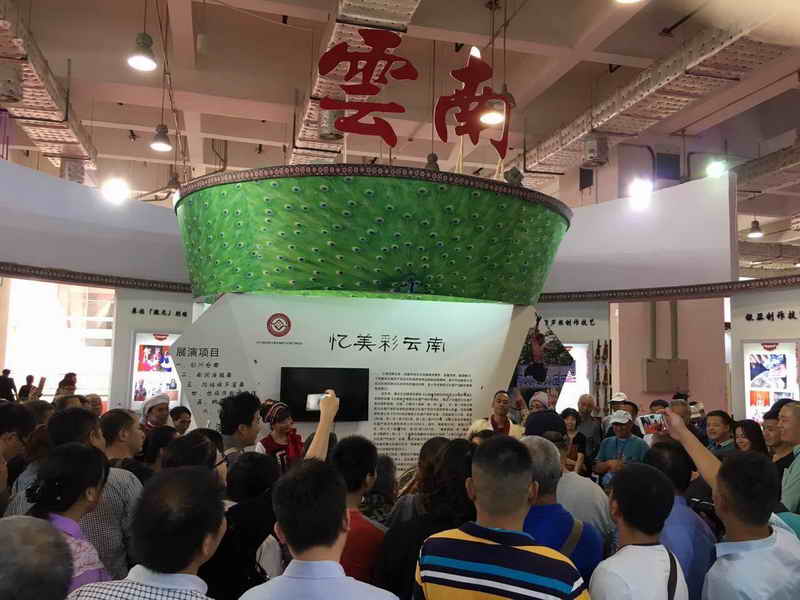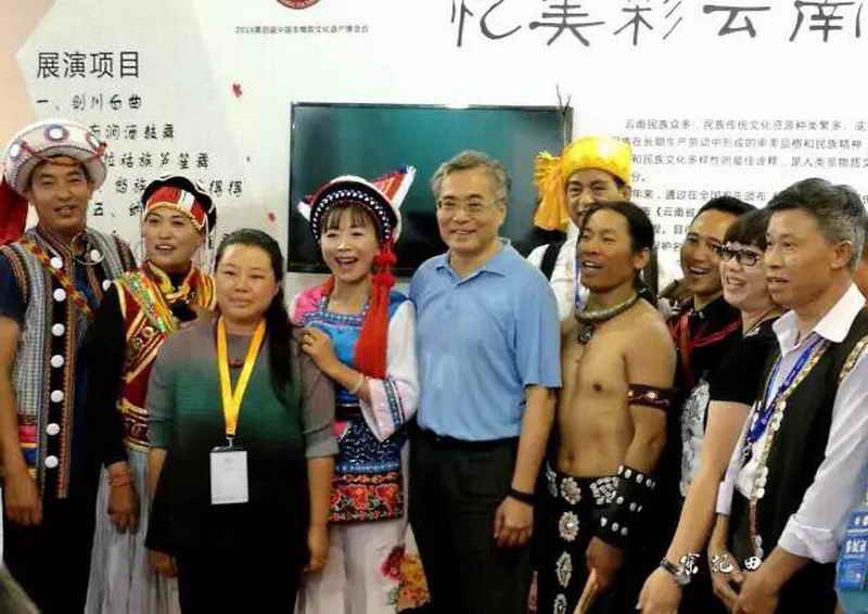 博览会展期间的云南省特装展示区,独具特色的传统技艺展示和具有浓郁民族风情歌舞展演,受到广大观众的热情欢迎和喜爱。展演传承人和现场观众的互动,掀起阵阵高潮,热烈的掌声激发传承人们的激情,原定每天两场的演出变成了观众和传承人们的联欢互动,随着观众的叫好声,传承人们似乎忘记唱了几首歌,传承人们唱到哪里,观众围观到哪里。一首拉祜族歌曲“实在舍不得”,把文化部的项兆伦副部长吸引过来和传承人们一同合影,传承人们开心地唱啊、跳啊!几乎忘记了闭馆时间。