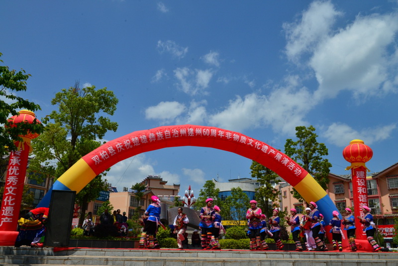 为庆祝改革开放40周年,全面展示建州60周年来,在党的正确领导和民族政策光辉照耀下双柏县经济社会发展所取得的辉煌成就,双柏县于4月10日在县城查姆广场举办庆祝楚雄彝族自治州建州60周年非物质文化遗产传承展演演出,城区及周边群众近1000余人参加了庆祝展演活动。