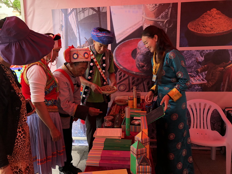 春初此次是代替其哥哥江参来参加展示的,虽然她不是迪庆藏香制作技艺的传承人,但她从小跟着哥哥江参学习,对藏香十分了解,在现场展示中十分熟练和耐心。看到展示摊位前源源不断来观看和询问的人群,春初觉得这一趟辛苦很值得。最后,我们为这些非遗传人和工作人员的敬业点赞吧。