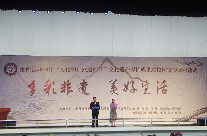 6月9日上午10点,活动在维西县第三中学拉开帷幕,各相关单位负责人参加活动;维西县文体广电旅游局局长宋斌致词,迪庆州文化遗产科科长李文君宣布2018年“文化和自然遗产日”展示展演活动开幕。活动通过传承队伍展演、全州各级文物保护单位保护成果宣传展示、文化遗产知识有奖问答、发放宣传册等形式,将迪庆州文化遗产代表性项目及其保护成果进行了通俗易懂,生动的宣传展示。让文化遗产传承保护伴随着祖国的花朵一起成长,留住民族之根。特别是有奖问答环节,学生们积极踊跃,使文化遗产相关知识的普及更加有效。