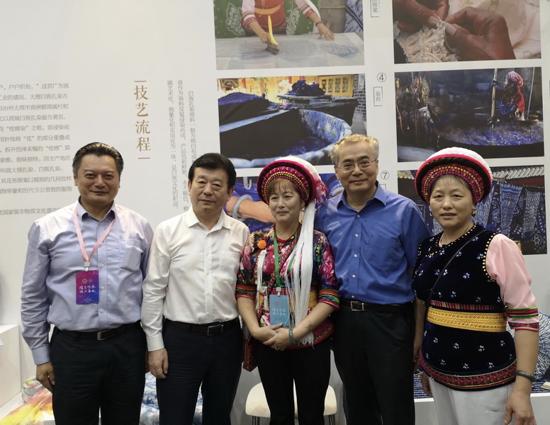 文化和旅游部副部长项兆伦,山东省人大常委会副主任于晓明,云南省文化厅党组书记、厅长李涛在云南“白族扎染技艺”展位前与传承人合影留念