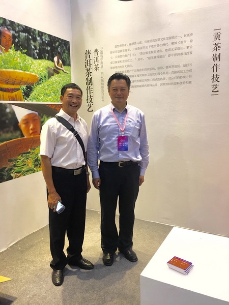 李涛厅长与云南“滇红茶制作技艺”传承人张成仁在相邻展位前合影