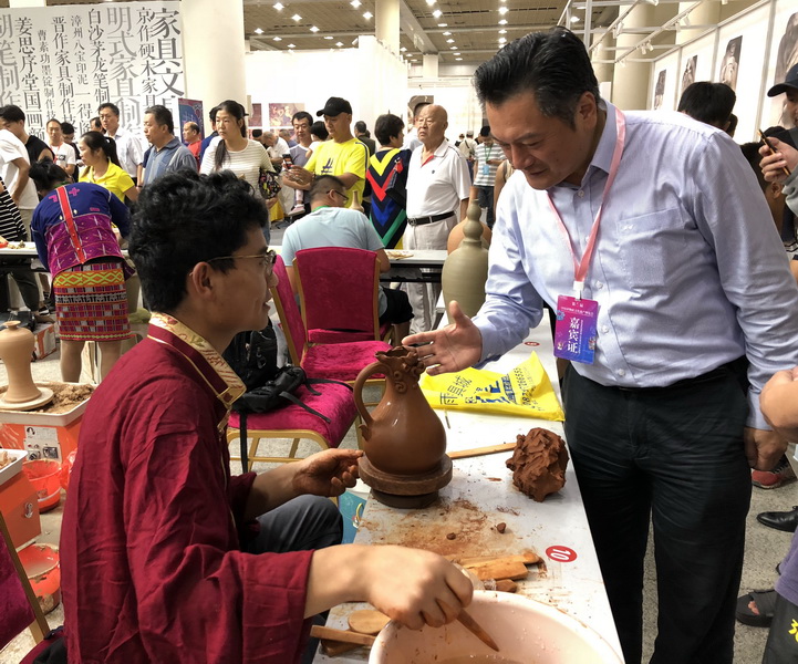 在博览会主会场,李涛厅长到云南省前来参展的国家级非遗项目“白族扎染技艺”“建水紫陶烧制技艺”“普洱茶制作技艺”“红茶制作技艺”展位前,向代表性传承人仔细了解了参展情况、传承状况和项目发展前景,并听取他们对非遗保护工作的意见,鼓励他们要坚定文化自信,坚守传统技艺,争做文化的传播者,将更多的云南民族优秀传统文化辐射出去、宣传开来。李涛厅长还参观了“北京料器”、广东“石湾陶塑技艺”、四川“道明竹编”、贵州“牙舟陶器烧制技艺”等兄弟省份的非遗展区,现场体验制作技艺,并向代表性传承人了解当地政府在非遗保护工作中给予他们的政策支持和扶持情况,鼓励他们更好地把技艺传承发展下去,为子孙后代留住中华民族的“根”和“魂”。