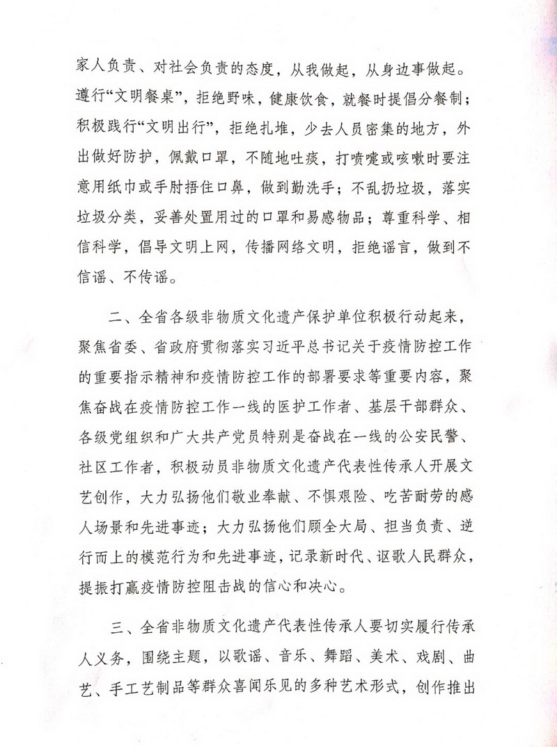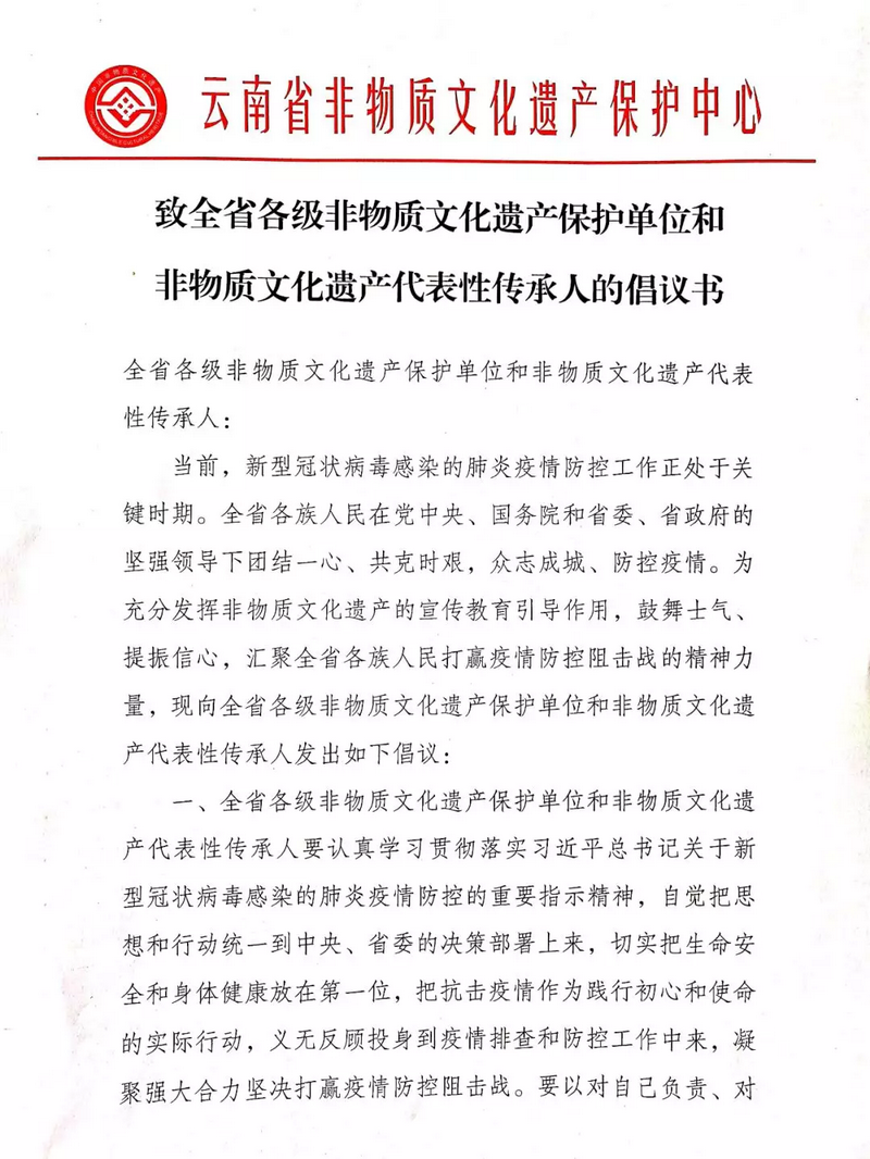 省非遗保护中心致全省各级非遗保护单位和非遗代表性传承人的倡议书