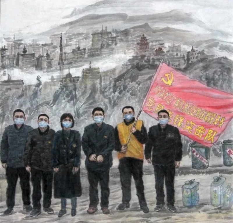 美术作品《党员抗疫突击队》作者:州级非遗代表性传承人黎明波 红河州非遗保护中心提供