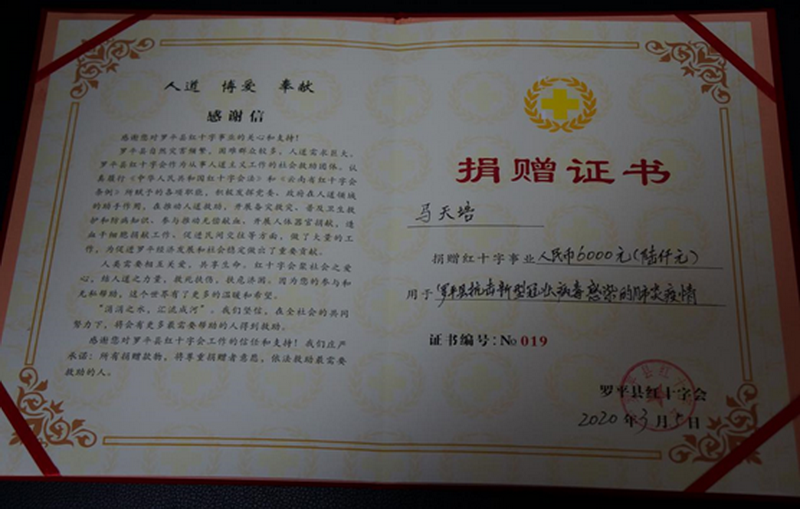 罗平县传统美术类省级非遗代表性传承人马天培(上图左二)在罗平县文化馆工作人员陪同下向罗平县红十字会捐款6000元,同时他还将徒弟及当地群众的捐款1200元,共计7200元交到罗平县红十字会,用于罗平县疫情防控。马天培说:“希望疫情可以早日过去,人们都可以脱下口罩,安心生活。我相信,只要我们万众一心,众志成城,就一定能打赢这场战役。”
