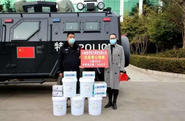 大姚县彝剧州级代表性传承人李桂兰(右一)向战斗在一线的公安民警捐赠口罩300个,消毒液5桶共100千克。她说:“看到警察同志这么辛苦,想尽点绵薄之力,希望警察同志做好工作的同时也保护好自己”。