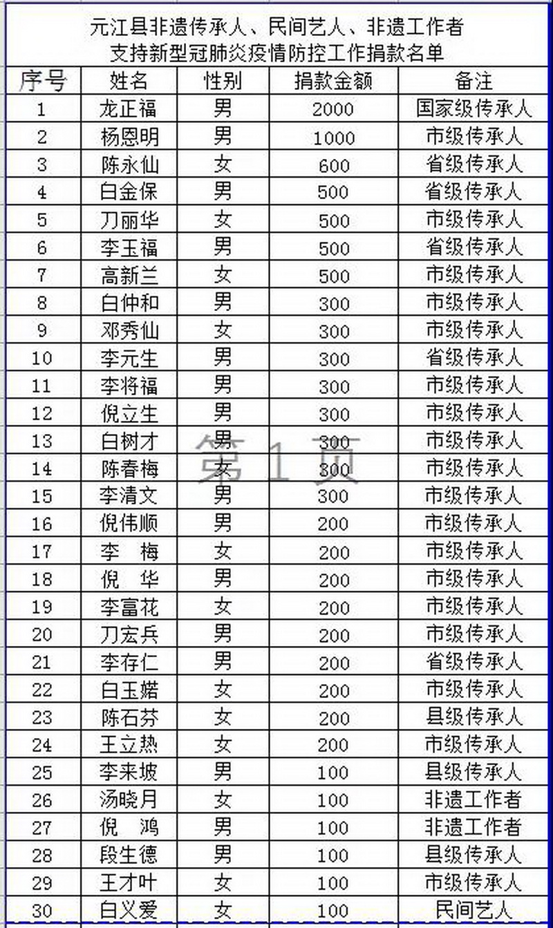 棕扇舞国家级代表性传承人龙正福积极响应号召,捐款2000元,为疫情防控贡献自己的力量。他说:“钱不多,但这是自己的一点心意,希望可以帮到他们。”