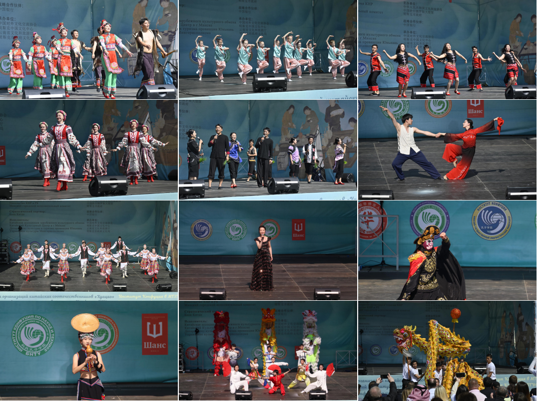 嘉宾致辞结束后,云南省文化代表团、在白华侨音乐家、在白孔子学院教师和志愿者、中国留学生、明斯克中小学生联袂为现场观众奉献了《打歌》《花腰歌舞》《甩发舞》等云南少数民族歌舞和《茉莉花》《月光下的凤尾竹》《美丽中国》《九儿》等中国歌舞和葫芦丝、古筝等民乐表演以及舞龙舞狮、川剧变脸、武术表演,白俄罗斯“恰巴洛克”模范民族舞蹈团穿插演出了《白俄罗斯的问候》《母亲的幸福》《白俄罗斯之心》《白俄罗斯的波尔卡舞曲》等白俄罗斯民族歌舞,现场不时爆发出阵阵喝彩和热烈掌声。