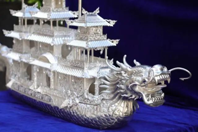 乌铜走银曾与北京“景泰蓝”齐名,并称“天下铜艺双绝”。是以铜、金等贵金属为原料,按一定比例熔化后造成坯,在坯上雕刻各种花纹图案,然后将熔化的银(金)走入细密的花纹图案中,冷却后打磨光滑,再用祖传工艺使底铜变成乌黑色,透出银(金)纹图案,呈现出黑白(黄)分明的装饰效果。即历经化料、秘方炼铜、锻片、錾刻、走银、成型、抛光、捂黑等十多道工艺制作成,使其在庄重深沉的黑底上衬托出银光闪闪的灿烂纹饰。