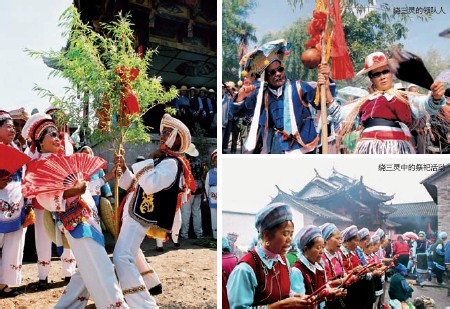 绕三灵是大理白族民间重大的风俗性文化节日之一,起源于南诏,最初是白族古代宗教祭祀的一种仪式。“三灵”是指洱海西岸三个神灵象征,是白族本主崇拜的几位重要本主和传入大理地区的佛教神祇,供奉它们的庙宇分别称为“佛都”(大理崇圣寺)、“神都”(大理庆洞村段宗榜本主庙)和“仙都”(河矣城村段赤诚的洱河神祠)。绕三灵来历有不同传说,较为普遍的一说是大理七十一村村民代表“本主”来朝拜“神都”的中央本主,祈求丰年而举行的一种仪式。据《滇中琐记》载:“大理有绕三灵会,每岁季春下浣,男妇咸集,殆千万人,十百各为群,群各有巫觋领之,相传起于南诏,数千百年不能禁止。盖惑于巫言、祈子嗣、禳灾病。”“绕”,是载歌载舞行进的意思。