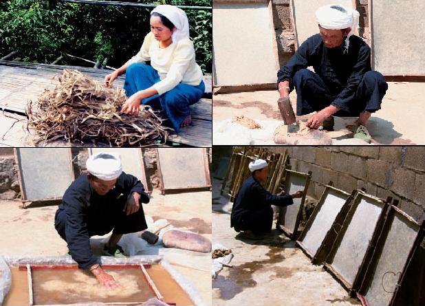 思茅市孟连傣族拉祜族佤族自治县芒信乡芒景寨傣族手工造纸工艺完整保留了中国古代造纸的5步工艺流程,包括采构皮、去杂质、浸泡、蒸煮、漂洗、打浆、浇纸、晒纸、揭纸等主要工序。造纸工具均为自制,有抄纸器、水槽、木槌、戥子、表面平整的石头或木块、煮锅和砑光工具等。工艺传女不传男,祖辈沿袭传承。
