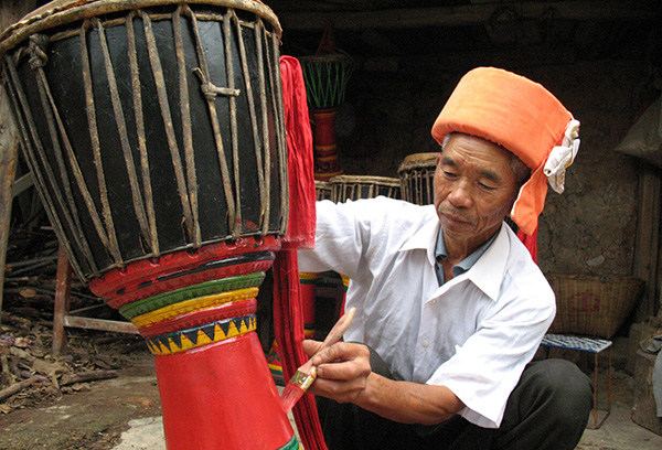 俸传诗,男,1941年生,现年70岁,俸传诗出生于青华村委会南汀河畔的傣族寨子。俸传诗1957年—1959年在青华缅寺当和尚,1978年接管青华佛寺,一直到99年在青华佛寺当住持,在接管青华佛寺后,他对象脚鼓情有独钟,加之青华佛寺经常到外地购买象脚鼓,买来的象脚鼓易坏,每一两年就要更新一次,坏掉的象脚鼓没有人修理,造成了极大的浪费,为此,俸传诗开始向师傅俸传金(已故)学习修理制作象脚鼓,经过师傅的精心培育,他学会了制作象脚鼓的全部过程,学会了象脚鼓的各种民间传统打法,掌握了多种高难度的技巧,2000年至今,俸传诗制作大小象脚鼓150多只,被村民们成为“鼓王”和“鼓仙”,他制作的象脚鼓被用于各种大小文体活动。