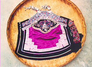 李赵仙精于服饰和刺绣,她所做的服饰以女装为主,有大上衣、小上衣、中上衣、头饰、围腰等,十分讲究色彩和图案的合理搭配。而她的刺绣也别有特色:先用牛皮纸剪出绣花底样,按底样挑好各部位的刺绣品,然后按尺寸裁剪布料缝合,把刺绣好的花纹图案搭配缝在服装的适宜部位上,再镶上银泡和各种银制装饰品,便成为一件件色彩绚丽、银光闪亮的艺术作品。