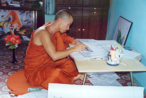 玛哈庄,俗名岩庄,10岁进本村佛寺当和尚时,拜老艺人波涛伟为师,学习民族工艺品制作,后在泰国清迈、朗捧省及曼谷多处佛寺拜师学佛学艺,因其努力钻研终有所成,经严格考试晋升为玛哈级僧侣,遂更名为玛哈庄。