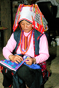 江培,女,哈尼族,1964年7月生,西双版纳傣族自治州勐海县西定乡曼瓦村委会贺松自然村人,刺绣艺人。