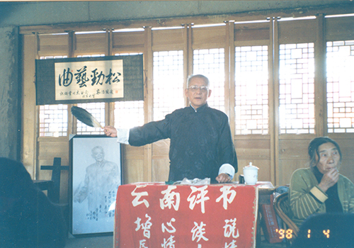 1990年以来,他正式在书场、茶室说书,先后讲过《三国演义》、《兴唐传》、《岳飞传》等几十部书,他搜集整理了有关说书的“脸谱”、“穿戴”、“兵器”、“赋赞”等100多条。较全面地把握了评书这一曲艺表演形式讲演技能,在昆明及省内群众中有较高的知名度和影响。他除了能讲评书,还能说单口方言相声。演唱花灯、滇剧,可谓多才多艺。