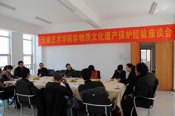 2011年4月2日下午,云南艺术学院非物质文化遗产保护经验座谈会在呈贡新校区综合楼301召开。会议由党委宣传部副部长付梅主持。云南艺术学院副院长潘红出席会议并做总结性发言,教务处郭浩处长、设计学院陈劲松院长、音乐学院李建英副院长、舞蹈学院徐梅副院长、文华学院廖开副院长和美术学院、科研处等有关部门负责人、部分教师代表及云南日报记者参加了会议。