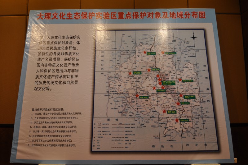 蔡春生副州长说,大理州旗帜鲜明地提出了“文化立州”的发展思路,着力建设民族文化强州,在大理这块自然和谐共荣的文化沃土上,谱写了先进文化建设新篇章。2008年3月,按照标准要求,启动了创建全国文化生态保护实验区工作,经过一系列富有成效的工作,今年1月6日,文化部正式发文,同意在大理白族自治州设立大理“全国文化生态保护实验区”。保护范围是:大理州所辖行政区域,涉及全州12县(市),110个乡镇、办事处,1074个村公所,50个社区居民委员会。具体是:以大理、巍山为中心的南诏大理国历史文化保护区;以大理洱海为中心的坝区白族民俗文化保护区;以云龙为代表的山地白族民俗文化保护区;以巍山、南涧、漾濞为中心的彝族文化保护区;以大理、宾川鸡足山为代表的佛教文化保护区;以大理喜洲为代表的白族建筑文化保护区;以各种文化艺术之乡为代表的民间艺术保护区;以白族本主文化为代表的民间宗教文化保护区。