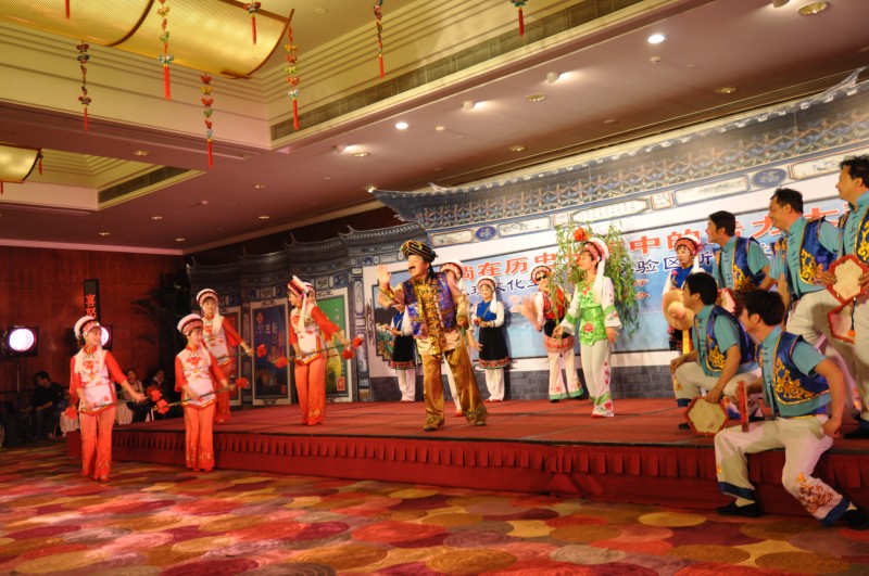 最后,大理州歌舞团演出了弥渡花灯、巍山彝族打歌、南涧跳菜、白族绕三灵等传统民族歌舞,使与会嘉宾和记者感受到了大理非物质文化遗产的魅力。