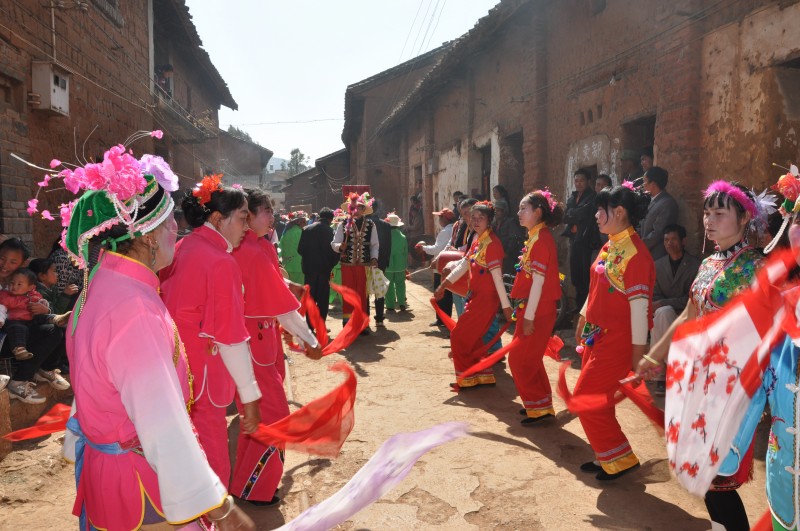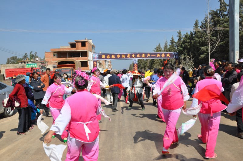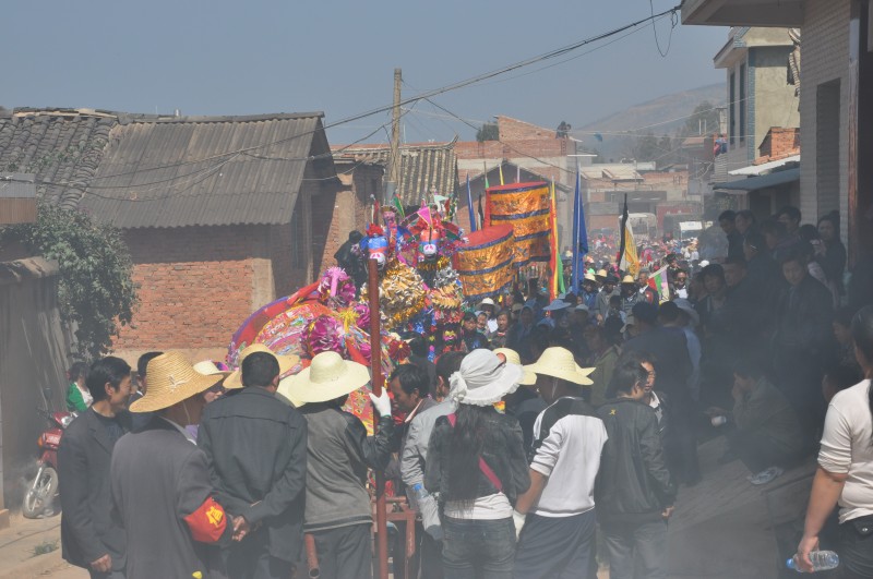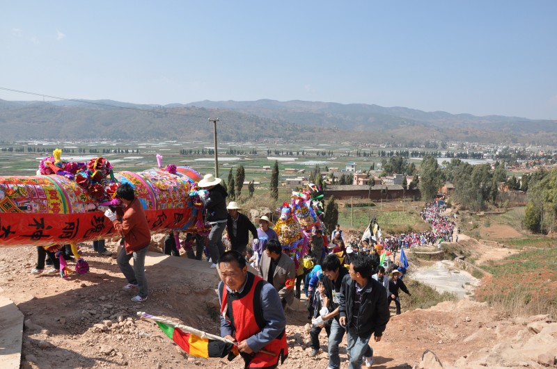 三声礼炮响过,仪式开始。分别由四个年轻力壮的小伙子抬着,另外八人护卫的两炷“大香”就上路了,一直要把大香抬到龙泉寺山门外。参加迎送“大香”的人群从山头的龙泉寺一直排到了山下村子旁的大公路上,大家站成两排,观看尾随“大香”后边的临村的关索戏、龙灯、狮子灯、花灯、打秧佬、搬打等带有祭祀和喜庆性质的文艺表演,两三公里长的文艺队伍边唱边跳,欢快热烈,把气氛推到高潮。