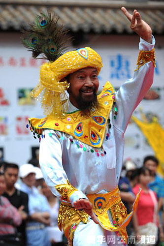 61岁的傣族老人约相为群众表演孔雀舞