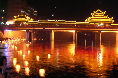 风雨桥下的河灯形成了一幅美丽的画卷