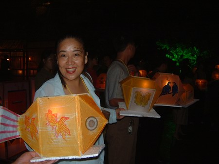 一位外地游客在放河灯