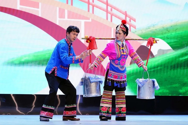 彝剧《过桥》讲述了村民张二簸发财后,在村民过路的河里架桥收费,“过河之人全收费,不论猪鸡和牛羊”,想的不是为乡亲们做啥好事,而是动起了歪脑筋,算计过往的百姓,结果害人终害己,尝到了自己酿的苦果....最后不收费,服务了群众。