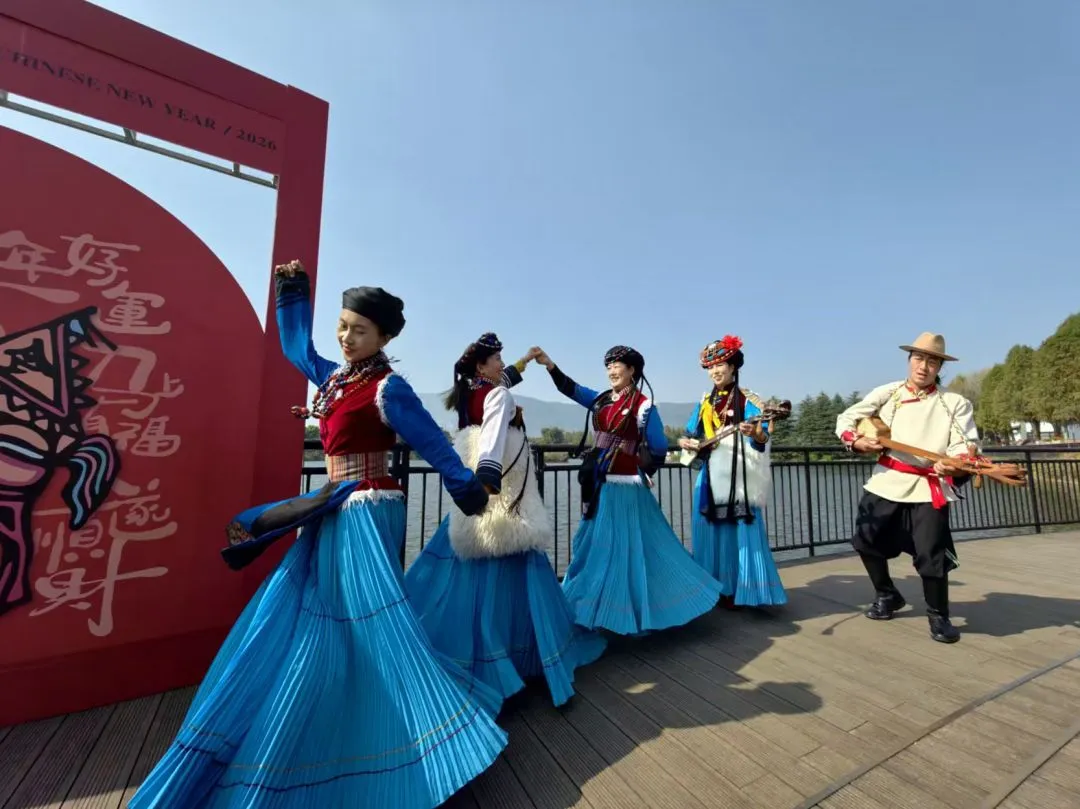 集中授课结束后,学员们各展所长,在云南民族村的白族村、“昆明故城”文化街区开展专场展演。婉转流畅的滇剧、古朴厚重的棕扇舞、激昂欢快的大三弦、丰富多彩的器乐演奏轮番登场,30多个精彩节目为景区增添了浓浓的年味,也为传承人搭建起交流互鉴、展示风采的优质平台。“教学演”一体的创新机制,有效将学习成果转化为“非遗+旅游”的特色资源,提升非遗现场感染力与公众参与度,生动展现云南非遗活态传承的蓬勃生机。