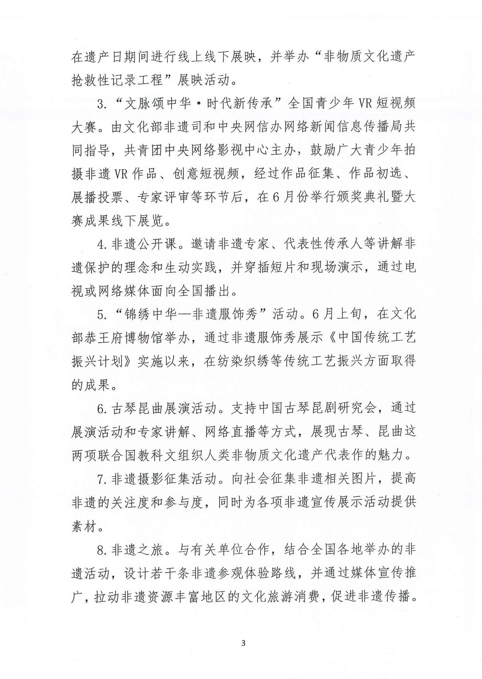 今年的“文化和自然遗产日”非物质文化遗产宣传展示活动意义重大,各地要坚持以习近平新时代中国特色社会主义思想为指导,深入贯彻落实党的十九大精神,牢固树立以人民为中心的工作导向,突出非遗在满足人民日益增长的美好生活需要方面的作用。坚持创造性转化、创新型发展,结合时代要求继承创新,广泛开展人民喜闻乐见、参与体验性强的非遗宣传展示活动。各地要积极落实中共中央办公厅、国务院办公厅印发的《关于实施中华优秀传统文化传承发展工程的意见》精神,大力宣传《中华人民共和国非物质文化遗产法》《云南省非物质文化遗产保护条例》和《保护非物质文化遗产公约》以及非遗知识,周密安排,精心组织,认真筹备,及时制定本地区、本部门、本单位的活动方案,组织好本地区“文化和自然遗产日”非遗宣传展示的主场活动;要突出主题,举办形式多样、丰富多彩的文化遗产展览、展演、讲座、咨询等活动,讲求实效,注重地方和民族特色,全面展示近年来非物质文化遗产保护工作优秀成果;要协同联动,与自然遗产、文物保护等有关活动结合起来,贴近民众,广泛开展非遗进校园、进社区、进基层活动,推动形成人人传承发展中华优秀传统文化的生动局面;要配合乡村振兴、精准扶贫等重点工作,宣传弘扬优秀传统乡土文化,促进乡村文化兴盛,推动乡村振兴;要认真贯彻执行中央和我省有关廉政建设的制度规定,按照厉行节俭而又不失热烈的原则,确保活动安全顺利开展。