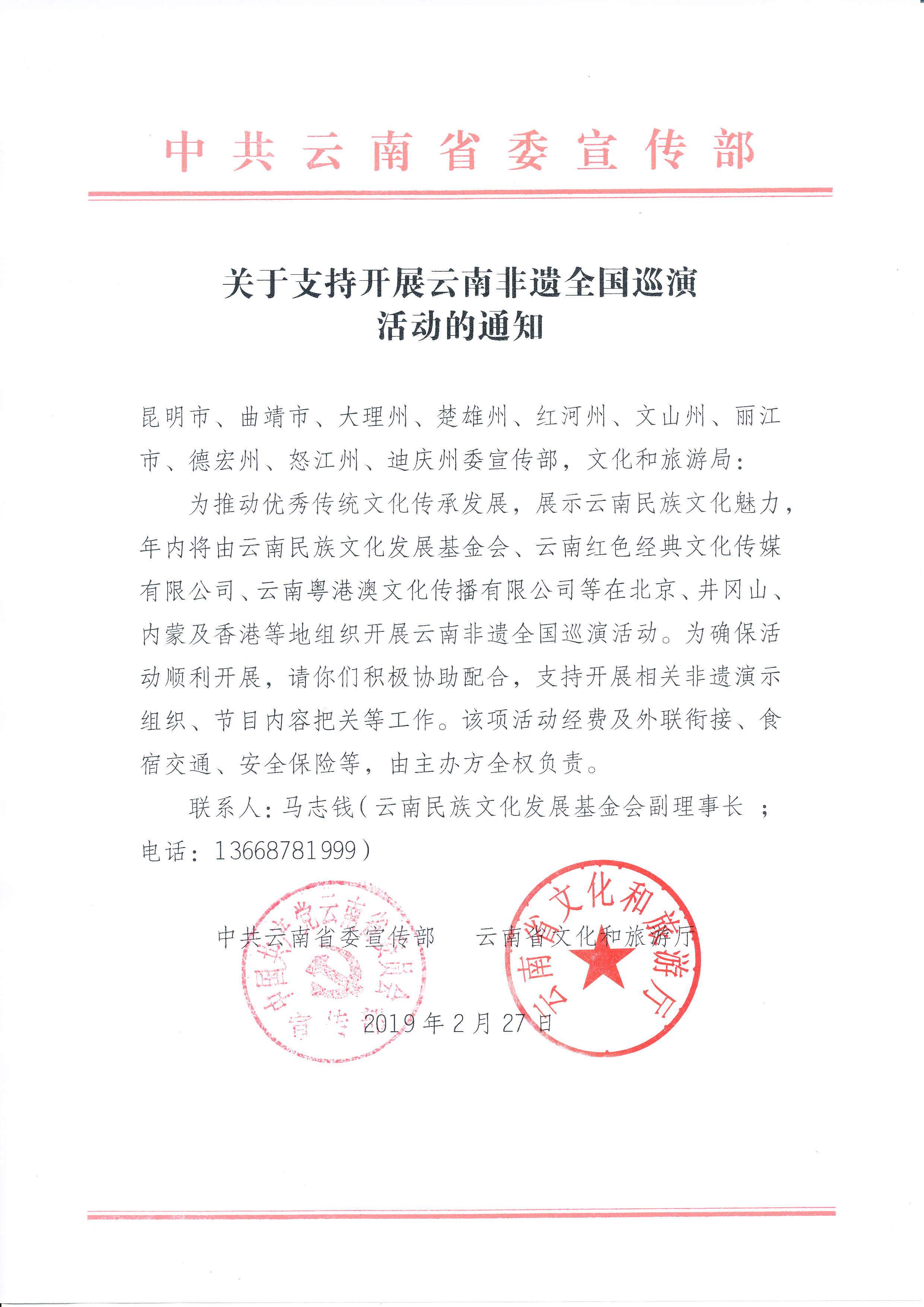 关于支持开展云南非遗全国巡演活动的通知