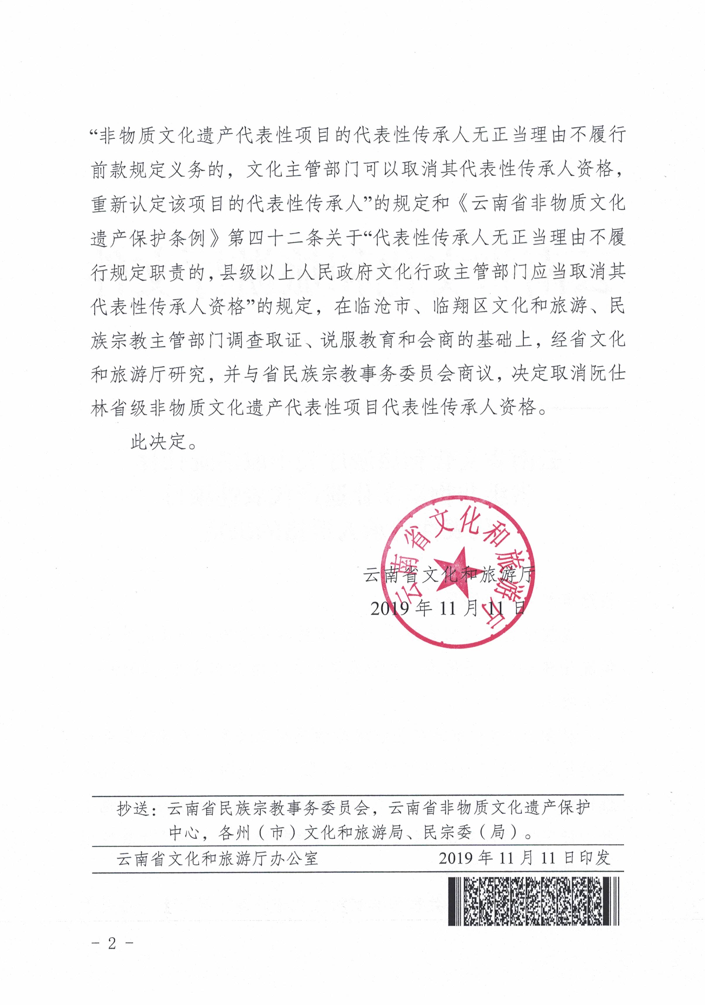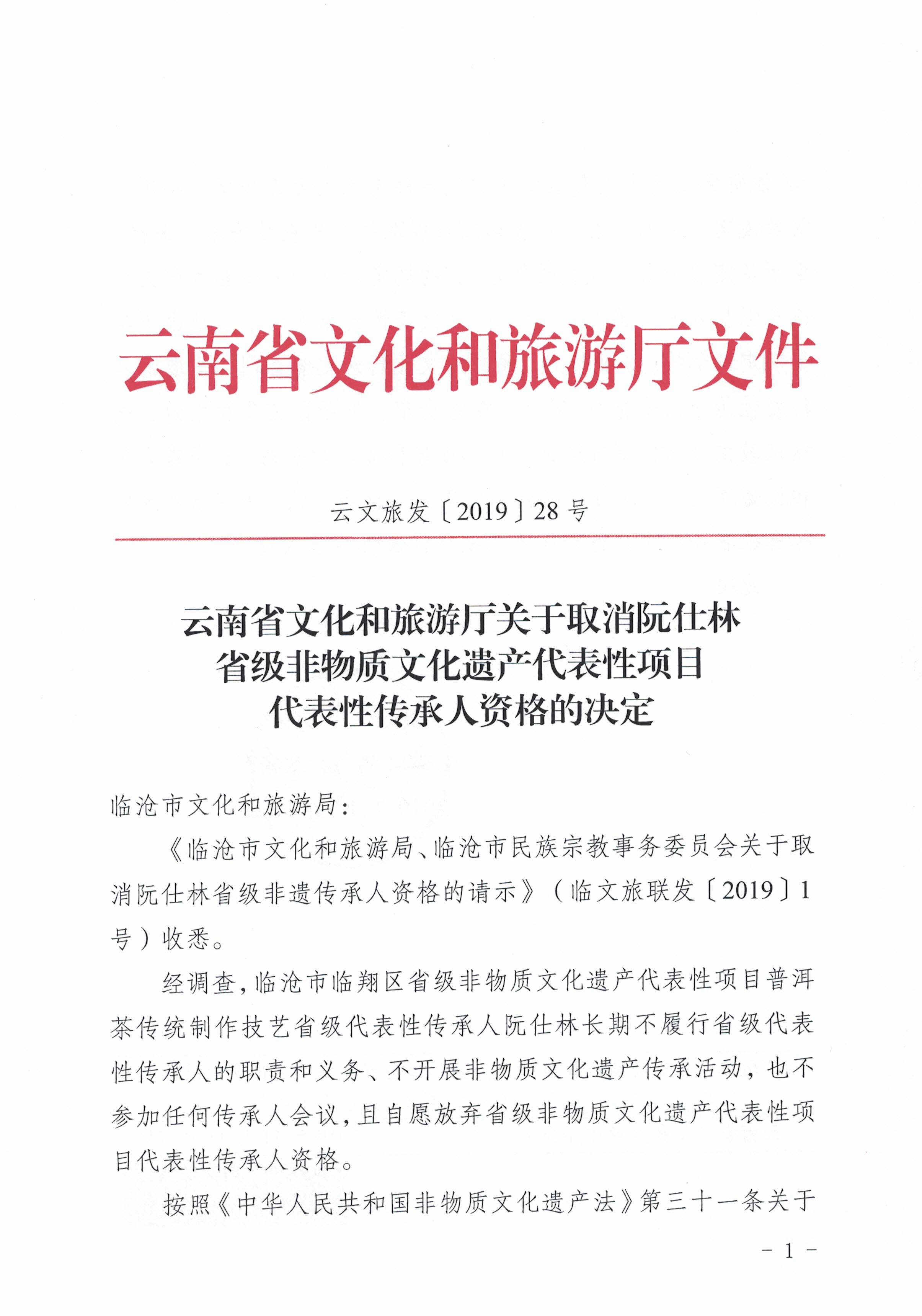 云南省文化和旅游厅关于取消阮仕林省级非物质文化遗产代表性项目代表性传承人资格的决定