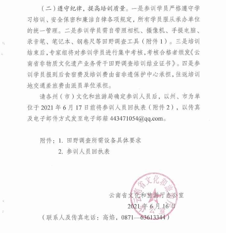 云南省文化和旅游厅办公室关于举办全省2021年非物质文化遗产业务骨干田野调查培训班的函