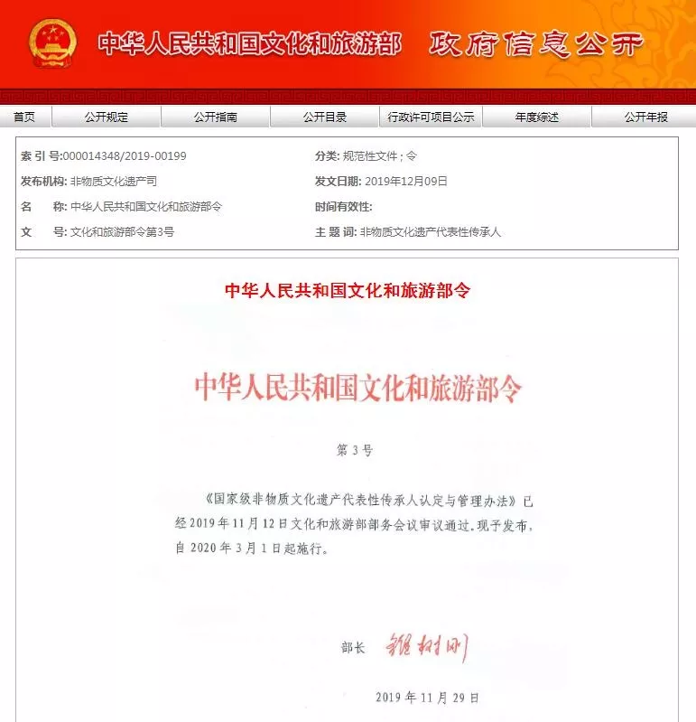 2019年12月10日,文化和旅游部官方网站发布《国家级非物质文化遗产代表性传承人认定与管理办法》(以下称《办法》),将于2020年3月1日起施行。