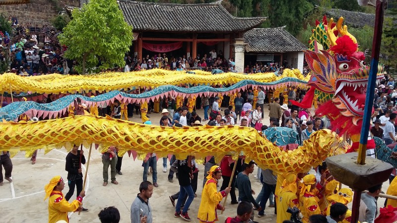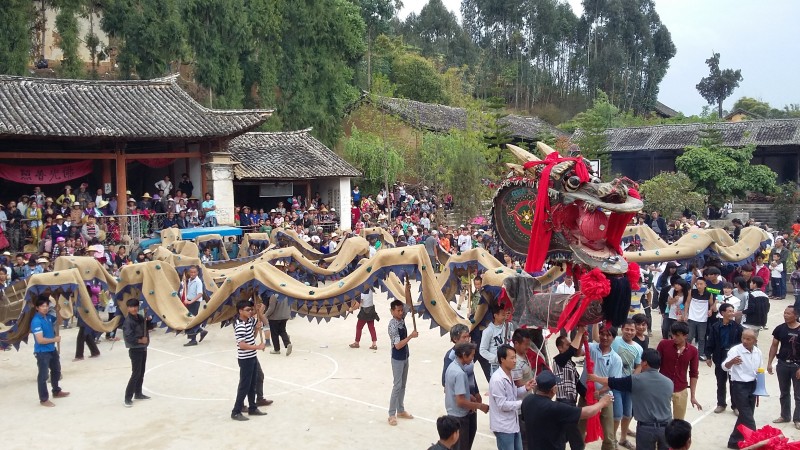 扎龙由白布缝制龙衣,经彩绘而成,由龙头、龙身、龙尾三部分组成,长短不一,有三十六节、三十节、二十六节、十六节,各节用木料制成框架,用金竹篾扎成筒形笼子,各配以木柄,舞龙人手持木柄耍玩,并以青黄相配成双出会。耍龙时,步调一致,动作协调,随着珠宝的动作,龙头、龙身、龙尾密切配合,形成宛若游动的活龙;耍龙形式有结盘、反回盘、龙吃水、龙摆尾和倒回龙等。百人抬举的大龙耍起来蔚为壮观,令人叹为观止。耍龙舞狮以男性为主,在当地有“二月十一大人玩耍妇女娃娃看”的说法。但这一天也是妇女儿童的节日,除了观赏表演,女人们穿红戴绿来赶集购物,孩子们可以随心所欲在各种小吃摊穿梭,乐此不疲。