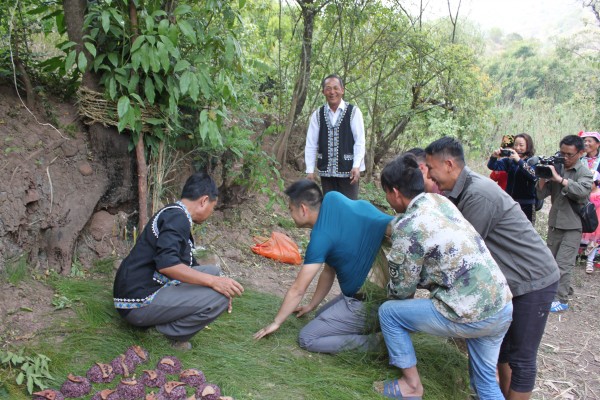 一早,村里的祭司就要从山上采来辟邪的尖刀草,编织“神绳”,将七彩纸、木刀、公鸡的鸡头、鸡脚、鸡毛编在“神绳”上,挂在村口辟邪,随后,祭龙树、祭山神、祭水神、献百家饭等。其中,最为特别的是“塞松毛求子”仪式,祭司念颂祭语后,村里还未“早生贵子”的新婚小伙就会被抬到龙树下许愿,由祭司掷下求子符,若符子显示一正一反,则表示许愿成功,其他小伙会把松毛塞进许愿人背里,鼓鼓的衣服就像背上了胖娃娃,借此表达对他“早生贵子”的诚挚祝福。一系列古朴而神秘的仪式后,每家各抬上一桌具有本族特色的饮食,摆起了蜿蜒的祭龙宴,没多会,悦耳动听的祝酒歌传来,笑闹声随之响起,古老的“抹黑”习俗开始了,一时间,一双双黑漆漆的手挥舞着,一眼望去,不论姑娘小伙,老人孩子,脸庞上都挂上了黑呼呼的烟灰,场面趣味十足。