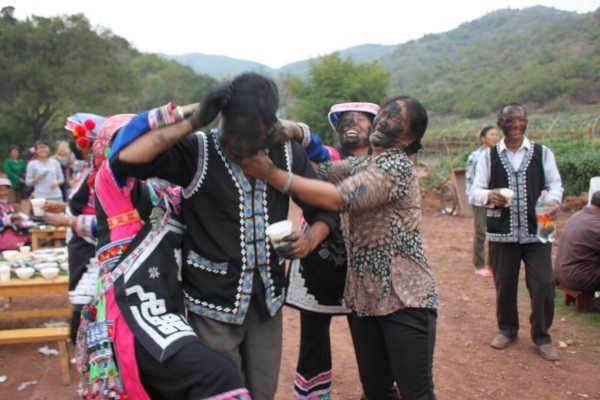 据老人介绍,古时这习俗是窝尼年轻男女认识、定情的方式,小伙看上了姑娘,就悄悄把黑呼呼的烟灰抹上姑娘的脸,作上记号,如果姑娘也喜欢对方,就回敬一点,若不喜欢就不抹。但习俗延续至今,已逐渐演变成了彼此祝福的方式,谁更黑谁就更有人缘,得到的祝福也更多。