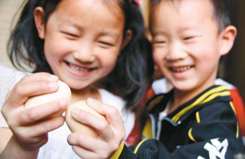斗蛋游戏 立夏日,大人用丝线编成蛋套,装入煮熟的鸡蛋、鸭蛋,挂在小孩脖子上,供他们相互比试,称为斗蛋。鸡蛋两端,尖者为头,圆者为尾。游戏时,蛋头对蛋头,蛋尾对蛋尾。一个个斗过去,破碎者认输,最后分出高低。蛋头胜者为第一,蛋称大王;蛋尾胜者为第二,蛋称小王或二王。俗谚说道:“立夏胸挂蛋,孩子不疰夏”。