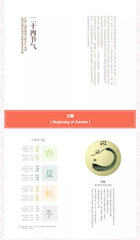 古代立秋分为三候:“初候凉风至”,立秋后,我国许多地区开始刮偏北风,偏南风逐渐减少,北风给人们带来了丝丝凉意。“二候白露降”,由于白天日照仍很强烈,夜晚凉风刮来形成一定的昼夜温差,空气中的水蒸气清晨时在室外植物上凝结成一颗颗晶莹的露珠。“三候寒蝉鸣”,这时候的蝉,感觉到阴气上升,太阳光已成强弩之末,一日不如一日,因而鸣叫得更加响亮、凄切。