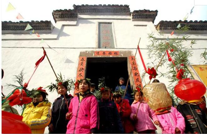 在浙江衢州九华立春祭活动中,迎春仪式是一项重要内容。迎春祭祀前,要预备“迎春接福”案桌,将案桌放置在梧桐祖殿大门外正中位,在案桌前披上写有“迎春接福”字样的红纸(锦),案桌中间放饭甑,盛得尖满,甑后置一杯清茶,左右放置香炉、烛台、梅花、松柏、竹枝等,象征洁净、长青和富足。在交春时刻前,主殿开门迎春;交春时刻,鸣放鞭炮,焚香行祭礼迎春。