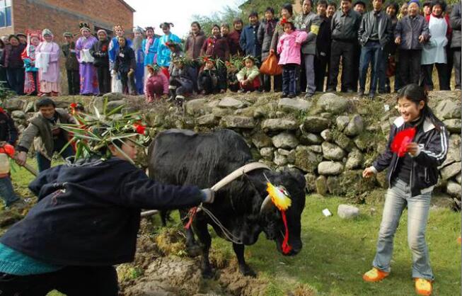 鞭春牛 又称打土牛、打春、鞭春,是汉族和白族立春的主要习俗。古代立春时举行鞭春之礼,既是鼓励农耕,也承载着人们对五谷丰登的美好期盼。《燕京岁时记》记载:“立春先一日,顺天府官员,在东直门外一里春场迎春。立春日,礼部呈进春山宝座,顺天府呈进春牛图,礼毕回署,引春牛而击之,曰打春。”